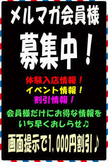 | メルマガ会員様募集中! メルマガ会員様だけにお得な情報をいち早くお知らせします! ・体験入店情報 ・イベント情報 ・割引情報 受付でメルマガ画面をご提示いただければ1,000円を割引いたします♪ |
