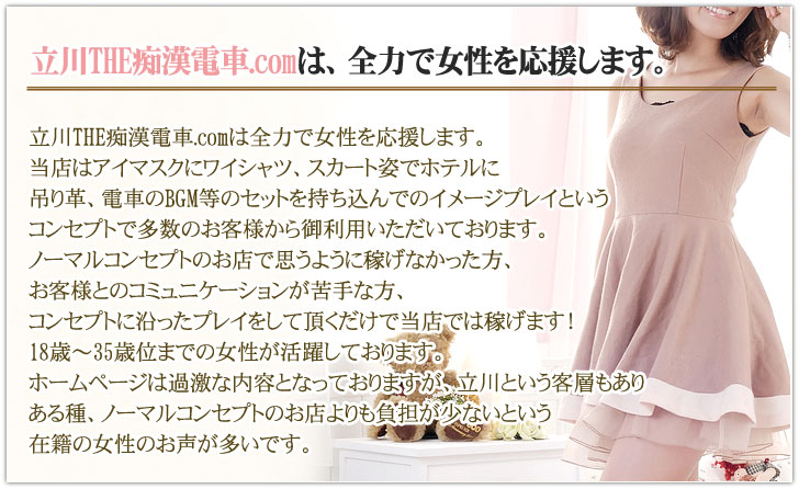 立川THE痴漢電車.comでは、働く女性の方々になるべく快適な環境でお仕事していただける様なお店づくりを目指しています。女性が待機する場所も個室となっており、落ち着いて働ける環境になっております。男性スタッフも明るくて優しいスタッフを採用しておりますので、働きやすいと思っていただけると自負しています♪